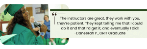 Through the GRIT training, Daneerah and her classmates learned how to safely use power tools, test for and remediate contaminants, understand electrical currents, and mastered all the basics of construction. They spent time refreshing their math skills for accurate measurements and angles when building stairs, and they learned about energy efficiency and the importance of weatherizing homes. By the time Daneerah graduated, she had caulked and sealed every window in her mom’s house and installed new drywall in her own basement!